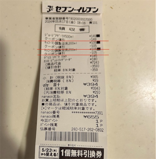 レシート内容とアプリのクーポンはこの様な感じです↓↓